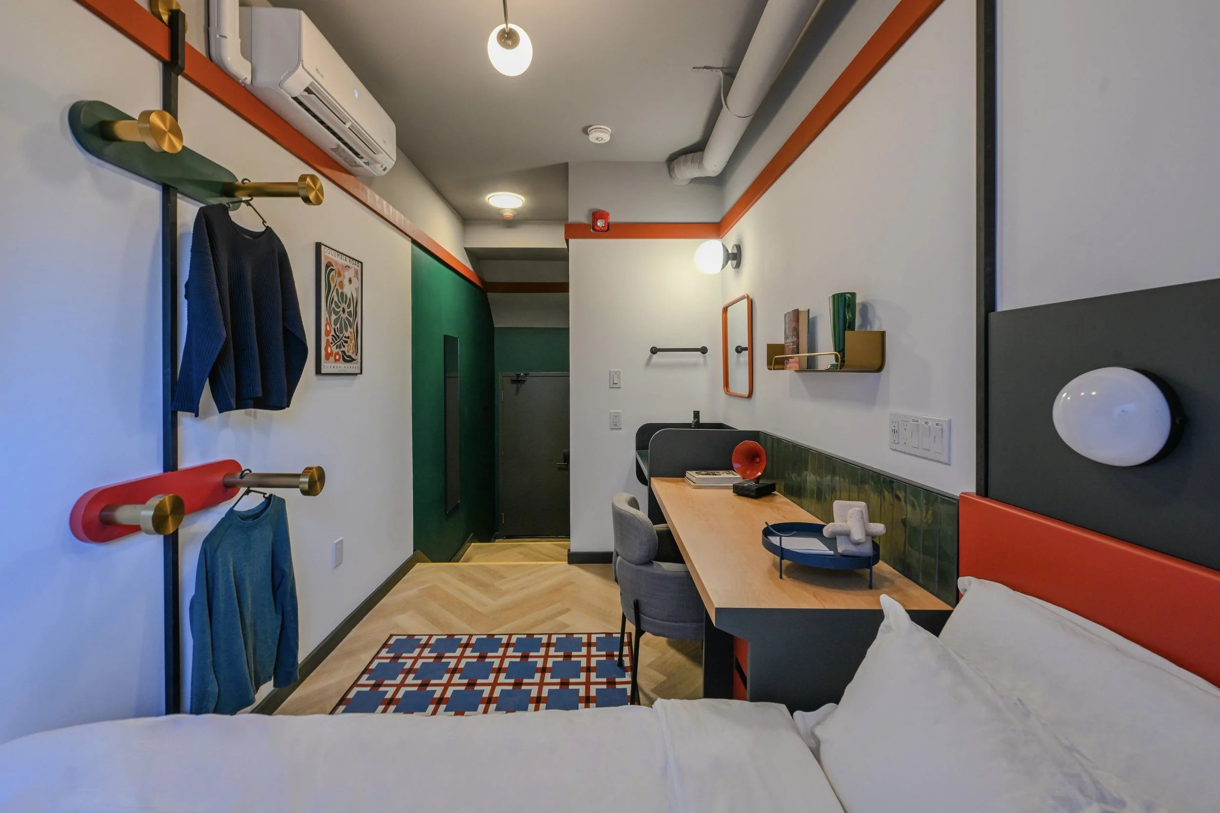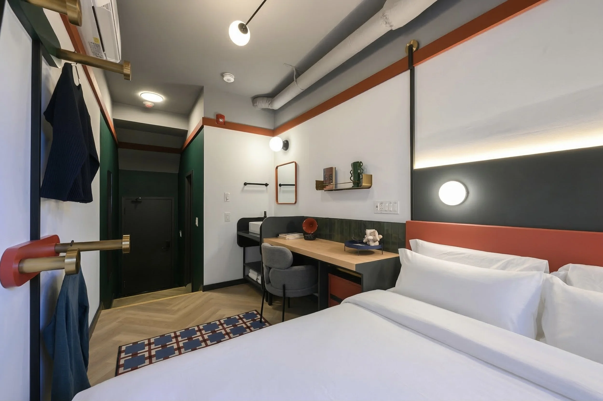 Our Economy Rooms distill the Nomas experience into intentional calm. A restful queen bed anchors the space, creating a surprisingly complete base for work or rest — a room that proves you don't need excess to feel exceptional.